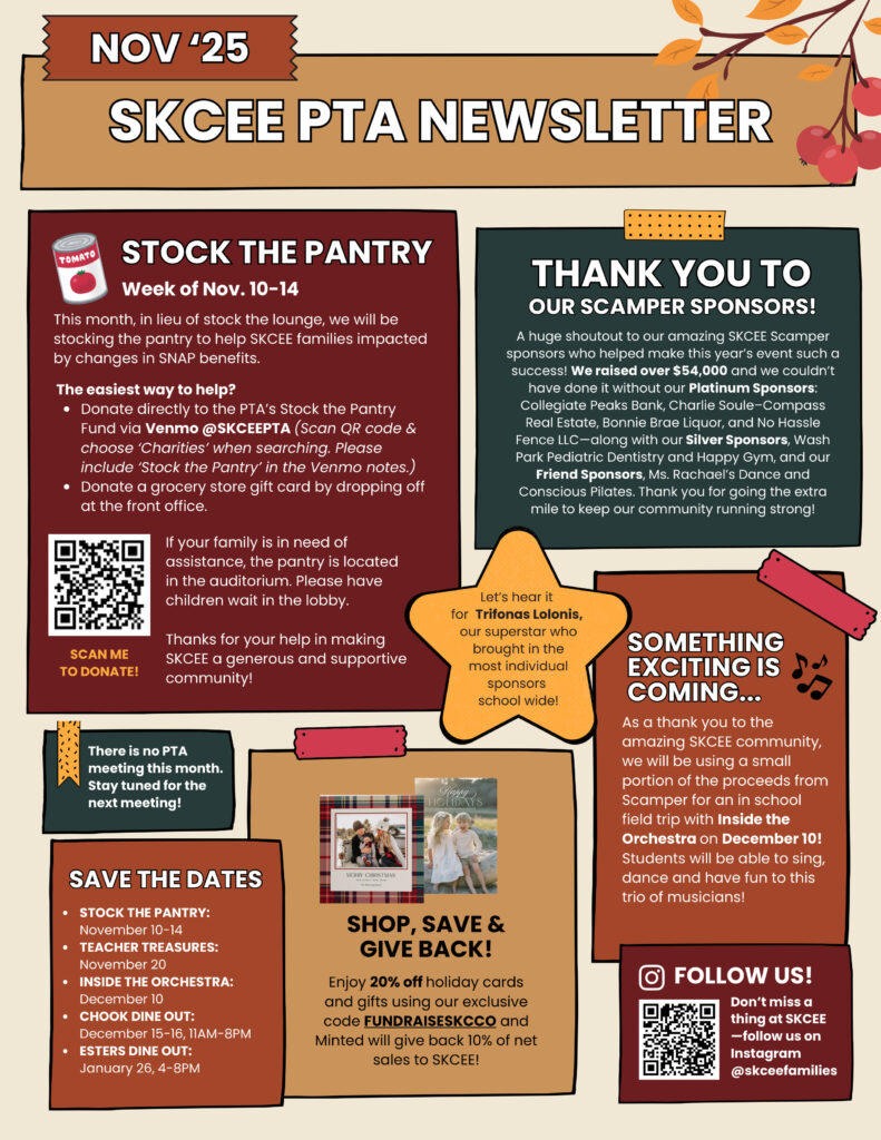 The SKCEE Scamper is our school’s biggest and most exciting fundraiser, combining two fun events—the Fun Run and the Online Silent Auction! On Thursday, October 30th, students will run, jog, or scamper around the SKCEE field while friends and family cheer them on. Then, from October 27th to November 1st, the Online Silent Auction will feature incredible items like getaways, gift cards, sports tickets, and unique experiences. This year, our goal is to raise $30,000 to fund a paraprofessional and provide teachers with extra classroom resources that make SKCEE such a magical place for our kids to learn and grow.